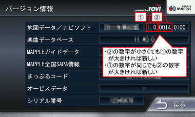 - 「地図データ/ナビソフト」の項目のナビソフトのバージョンを確認してください。