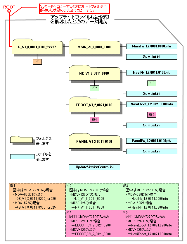 - SDカードにはお使いのカーナビゲーション機種のアップデータ以外のフォルダ、ファイルを置かないようにしてください。