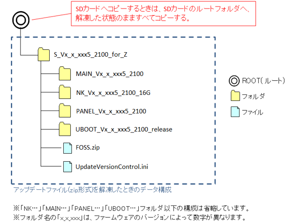 - 解凍後のアップデートファイルをSDカードへコピーする。