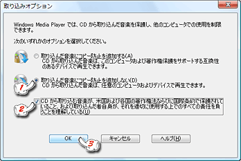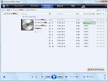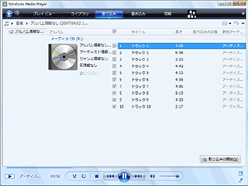 詳細な操作方法については、Windows Media Playerのヘルプをご覧下さい。 【メモ】 スクリーンショットはクリックして拡大する事が可能です。(一部拡大できない物もあります) スクリーンショットは、Windows Vistaをもとにして作成しています。 ご使用のOSや使用環境によって、異なる場合がありますのでご注意下さい。 【ご注意】 CCCDなどのコピーコントロール技術を採用したディスクについては録音(リッピング)出来ないものがあります。 お手持ちのディスクをご確認下さい。 |