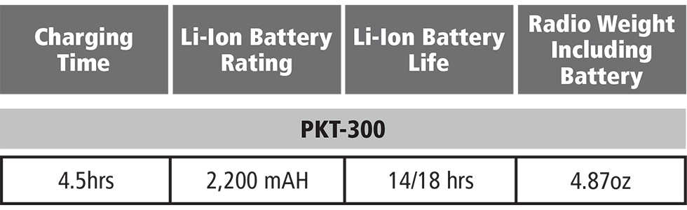 Compact enough to carry anywhere with ease, the PKT-300 has a distinctively ergonomic form that’s easy to hold and operate. It weighs 4.87oz (138 g) with the rechargeable Li-ion battery and control buttons, which are simple to use with PTT, MON, MENU, CALL, UP and DOWN operations.